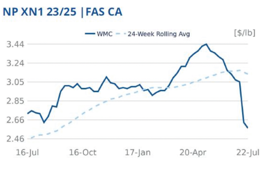 Uno de los golpes más fuertes al mercado se produjo tras la publicación de la Estimación Objetiva del USDA, que elevó la proyección de cosecha a 3.000 millones de libras, 200 millones por encima de la Estimación Subjetiva. Esto generó un desplome inmediato en los precios, con una caída de US$0,40/lb.