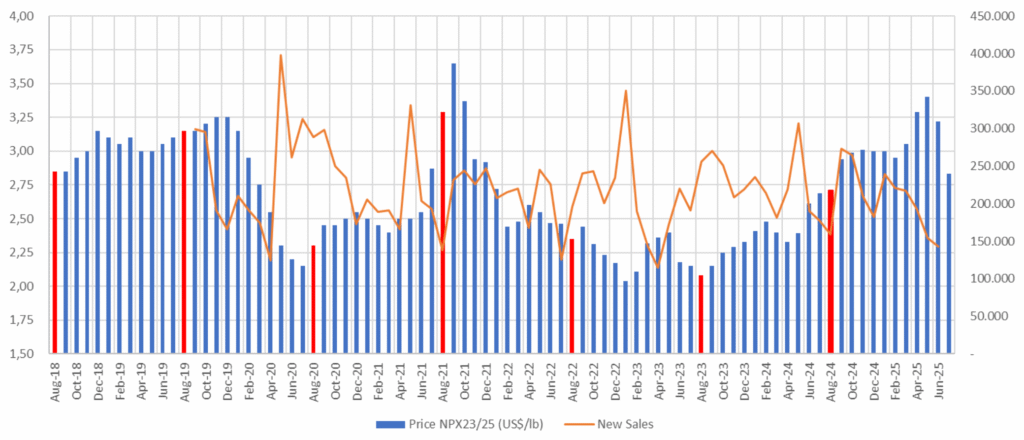 Las ventas nuevas también reflejan el momento complejo del mercado. Con 142 millones de libras comercializadas, se observa un descenso del 25% respecto a junio de 2024. Especial preocupación generan las cifras de la cosecha nueva, cuyas ventas alcanzaron apenas 46 millones de libras, un 53% menos que el año anterior. Las ventas domésticas, por su parte, sumaron 51 millones de libras, lo que representa una baja del 7%.