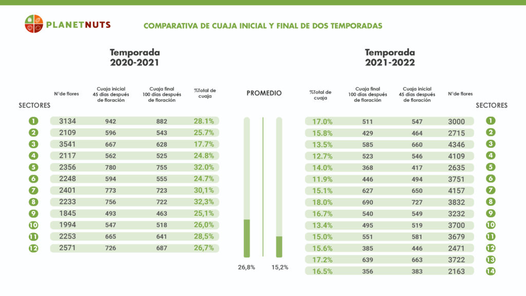Comparativa de cuaja inicial y final en almendros de las últimas dos temporadas